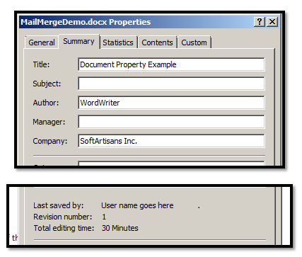 With WordTemplate.SetDocumentProperty, you can customize the built-in document properties (a full list is available here). This includes properties that can’t be accessed from Word, such as ‘Last Saved By’ and ‘Revision Number.’