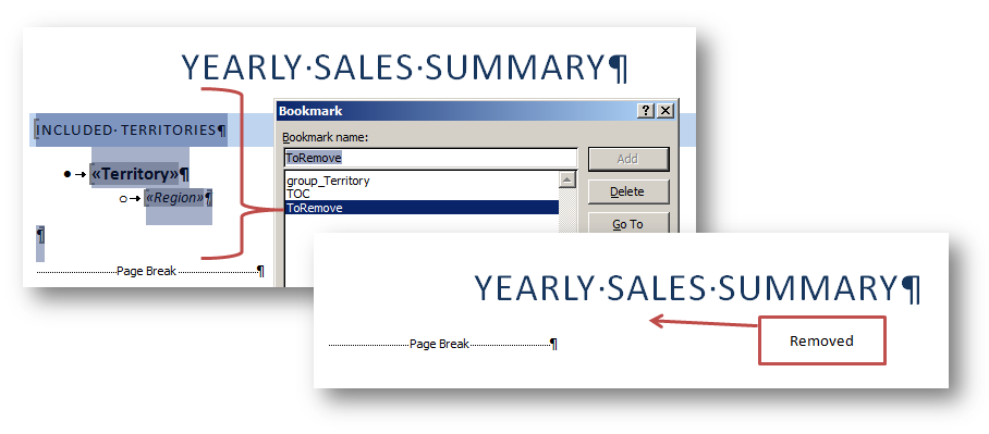 The new WordTemplate.BookmarksToRemove property lets you specify a set of bookmarks to be removed from the template file. The bookmarks, as well as all of the content inside, is removed in the output file. You can remove optional content from your DOCX and DOCM template files just by wrapping it in bookmarks.