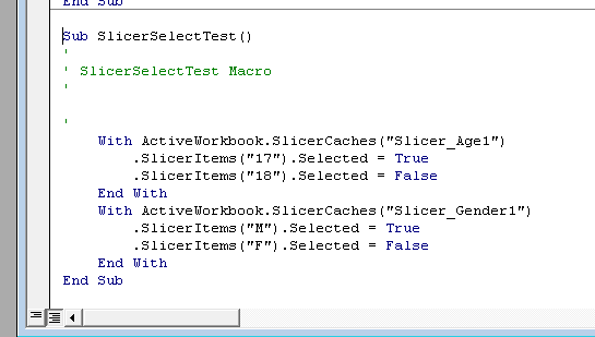 Whenever I need to write a PivotTable macro, I always start by recording myself performing the action I want and then generalize the code later. In this case, I want to select only “M” and “17” in my slicers for 17-year-old male students.