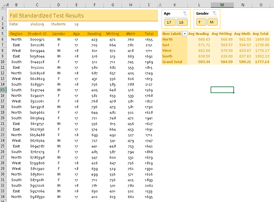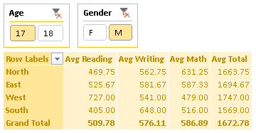 Let’s start out with an ExcelWriter report template. It has some data off to the side and a PivotTable that summarizes the test scores with averages. There are two slicers for filtering on age and gender.